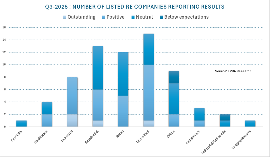 Between July and September, EPRA tracked a total of 68 companies across the continent reporting quarterly or semi-annual figures, where 61 of them showed positive or neutral results (aligned with market expectations), 4 of them reported outstanding figures (even increasing their own annual guidance) and only 3 of them did not reach market expectations. Here, we summarize some of the key trends in terms of operations, property valuations, financing conditions and earnings momentum that are shaping the industry’s positive outlook.