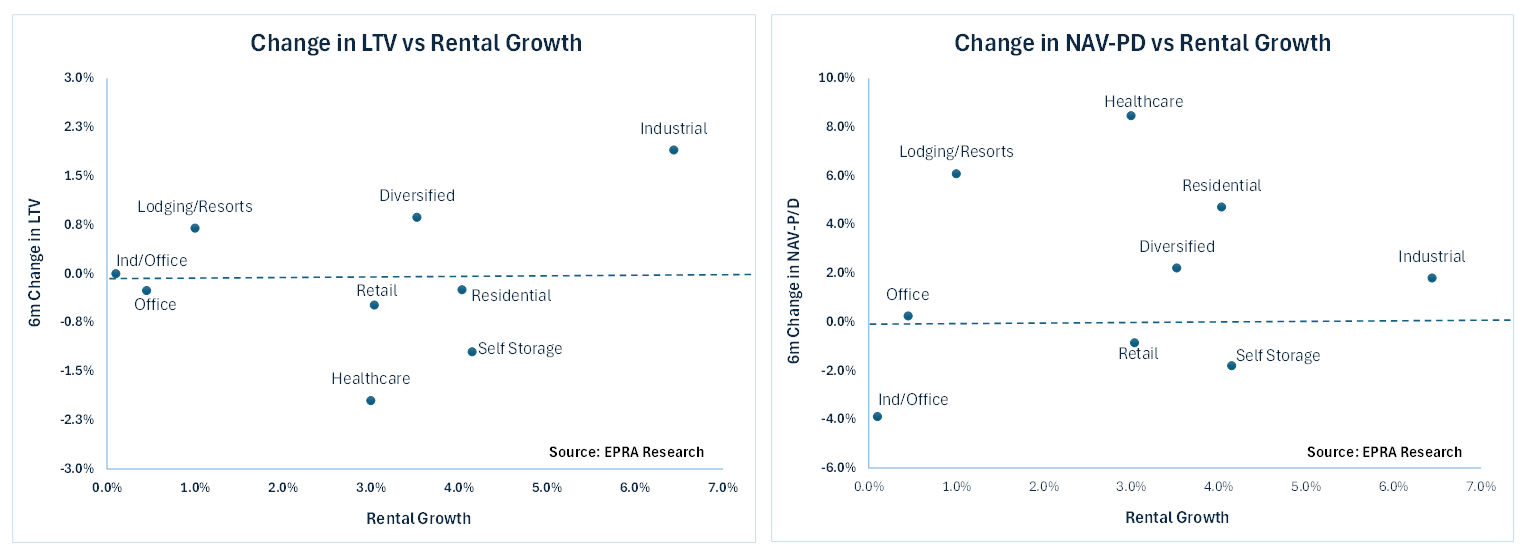 The LTV ratios are generally stable or improving, with most companies reporting LTVs in the range 18% to 50%, with no significant change on an aggregated level compared to Dec/2024. However, companies with stronger rental growth are also showing a slight increase in LTV that seems to be perceived positively by investors, pushing for lower discounts to NAV and even turning to slides premium in some cases.
